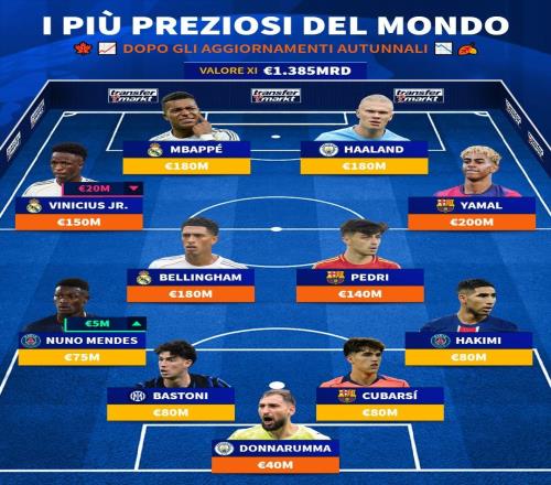 在完成最新一次身價更新后,德國轉會市場網站列出了世界足壇最貴陣容,皇馬、巴薩各3人,曼城、巴黎各2人,國米1人...