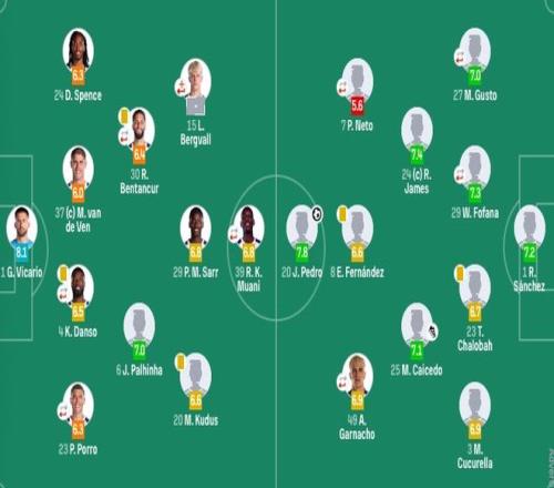 熱刺首發:1-維卡里奧、4-丹索(60'17-羅梅羅)、37-范德芬、23-波羅(73'13-烏多吉)、24-斯賓塞、6-帕利尼亞、15-貝里瓦爾(7'7-哈維-西蒙斯(73'28-奧多貝爾)))、30-本坦庫爾(60'9-里沙利松)、29-薩爾、20-庫杜斯、39-科洛-穆阿尼(73'22-布倫南-約翰遜)