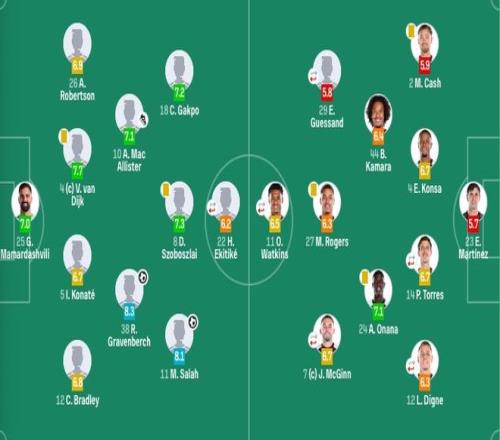 利物浦首發:25-馬馬爾達什維利、4-范戴克、5-科納特、12-布拉德利、26-羅伯遜、8-索博斯洛伊、10-麥卡利斯特、38-赫拉芬貝赫、11-薩拉赫、18-加克波、22-埃基蒂克(77'7-維爾茨)